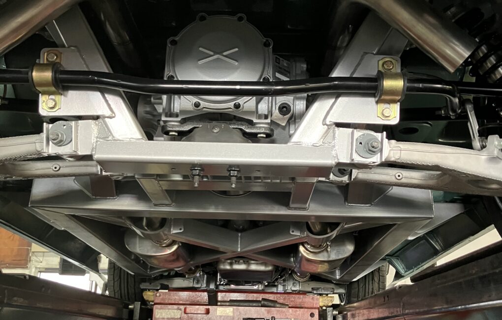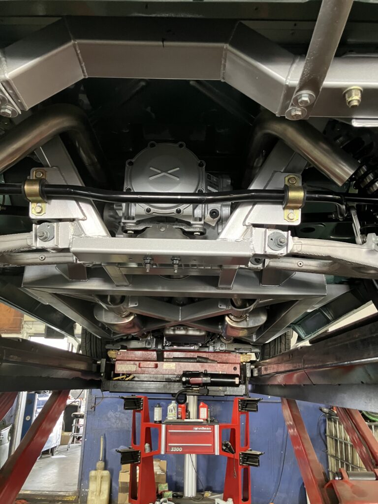 The suspension features C7 spindles, upper and lower control arms, and a Detroit Speed power rack and pinion.
