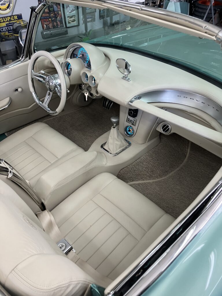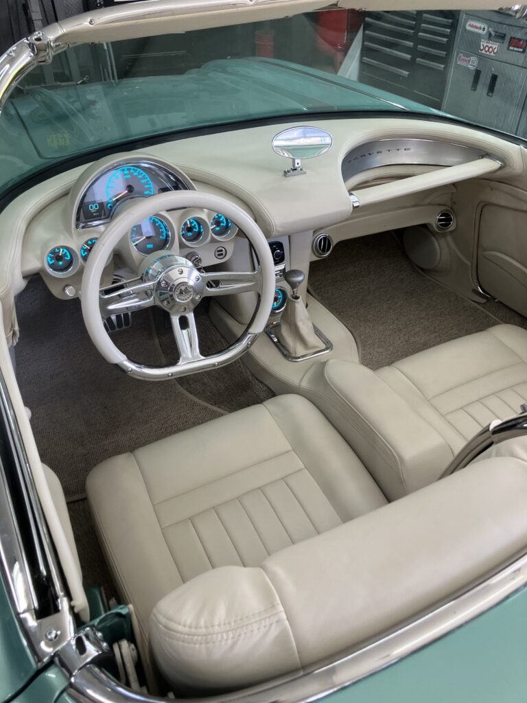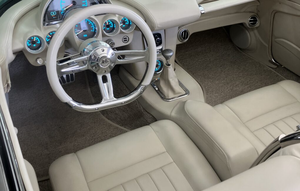 The interior is finished in Italian Linen hand-rubbed leather with a smooth custom dash, Dakota Digital gauges, a custom Corvette Dynamics leather-wrapped console, and a control tower housing Vintage Air controls and a bluetooth audio system.